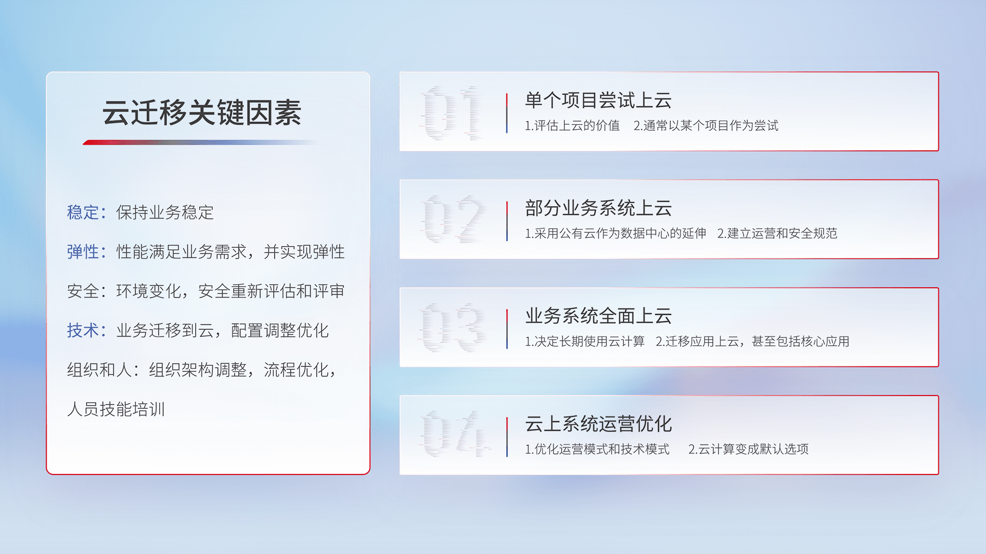 结合实际业务,,从规划设计、、、云平台选型、、、、云原生改造、、数据迁移、、、、集成交付,,迁移全过程为客户识别最佳上云路径,,,,做好风险识别管理,,,设计网络架构、、、身份权限、、、、安全审计合规、、、操作审计、、日志审计、、、、监控告警策略、、多站点容灾设计等,,,对云上基础设施进行整体规划,,,提升IT治理水平,,,,以满足弹性、、高可用、、、、高性能的需求。。